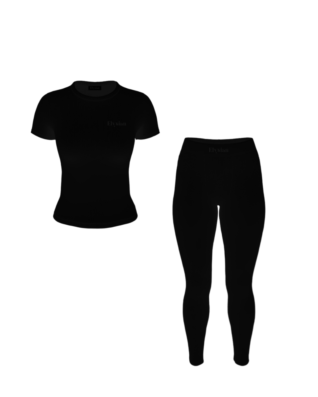 Matching 2 piece cotton ribbed set includes t-shirt and leggings with Elysian embroidery.
